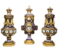 A Very Fine French 19th Century Royal Louis XVI Style Three-Piece Sèvres Gilt and Cobalt-Blue Ground Ormolu-Mounted Porcelain Urn and Clock Garniture Set. The finely decorated figurative Exhibition quality urns, modeled after a model of Jean-Claude Chambellan Duplessis the Elder (about 1695–1774), Designer- SèvresVase Grec à Ornements’, with coronet-form covers; the center vase with a cameo portrait of Louis XVI above a circular clock-face with Arabic numerals within floral wreaths and framed with an ormolu ribbons and wreath mount, with swagged gilt-procelain garlands ending on ribbons; the sides with cameo portraits of Marie Antoinette and the back with a cameo Coat-of-Arms for Louis XVI. The matching form side vases with swagged gilt-porcelain garlands and finely painted roundel cameos of the Court of Louis XVI and his family. All vases with a fluted neck, lower body and socle enriched with gilt foil and leaves. Bearing the Sèvres under-glaze markings. Circa: Sèvres, France, 1880-1890. Ref.: A2852