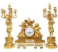 An Assembled Very Fine French 19th Century Louis XV Style Gilt Bronze and White Marble Figural Mantel Clock and Candelabra Garniture Set. The finely chased ormolu clock body, with its original two-tone mercury gilt, centered with a circular enameled porcelain clock face with Roman and Arabic numeral dials and inscribed 'A. Thomas - Fabt de Bronze - 56, Rue de Turenne - Paris', surmounted with a pair of playful seated cherubs amidst clouds and wreaths, the case crowned with a figure of a Gallic Rooster (Coq Gaulois - French Symbol), all above a carved white marble base with scrolled floral ormolu mounts and raised on six token shaped gilt bronze feet. The finely chased and mercury gilt pair of candelabra, each depicting a standing Putto holding a scrolled and floral six-light candelabrum, raised on a circular ormolu base surmounted with floral wreaths and rosettes. Circa: Paris, 1880-1890. Ref.: A2586-A2869 - Lot 11388