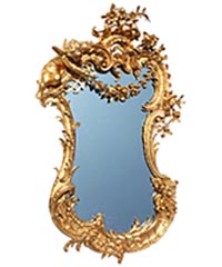 A Very Fine and Impressive English Rococo 19th Century Chippendale Style Figural Gilt-Wood Carved Overmantel or Pier Mirror in the manner of Thomas Johnson, after his Collection of Designs, 1758. The sectional divided ornately carved gilt wood frame crowned with a Chinoiserie figure of a seated man flanked by a pair of Ho-Ho birds on rocaille and icicles, above a howling fox, hounds, a flying Ho Ho bird and a goat, all within a foliate and C-scroll frame carved with turrets and rockwork. Circa: 1850-1880. Ref.: A1522 |