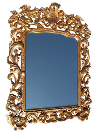 A Fine Austrian 19th Century Rococo Style Gilt Wood Carved and Gesso Overmantel Mirror Frame with Shelves. The ornately carved floral and scrolled crown centered with a mirror plate and a cone-shaped shelf, all above a three-sectional mirror frame flanked on each side by a scrolled shelf and floral carved corners. Circa: 1880. Ref.: A1603 |