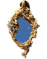 A Very Fine and Large Whimsical French 19th/20th-Century Louis XV-Style Belle Époque Giltwood and Gesso Carved Figural Mirror Frame. The beautifully carved and cast crest crowned by a female putto reclining against a feathered shell and holding a fan; surmounted by a hovering cherub carrying a mandolin on his back, the ornate scrolled frame enriched with foliate and acanthus decorations and featuring a silvered-leaf quiver with arrows; all original gilding retained. Circa: Paris, 1900. Note: Bearing a sticker on the back "Corinthian Studios Fine Arts". Ref.: A2873 |