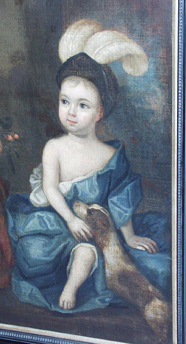 Description: A Very Fine English 18th Century Old Master Oil on Canvas Depiction Two Children, A young Price with a Dog and a Young Princess holding a basket of flowers. Circa: London, 1770. Height: 57 inches (144.8 cm)