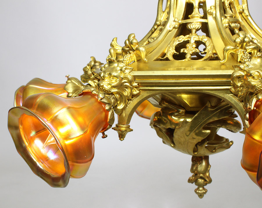 A Very Fine and Rare American Gothic-Revival Gilt-Bronze "Dragon" Six Light Figural Chandelier. The elongated body in the form of a winged dragon biting on a perch with his tail wrapped around an hexagonal pierced gilt-bronze basket surmounted with six lion masks, each holding an iridescence glass shade. The bottom of the fixture with the dragon's tail end, in the manner of Louis Comfort Tiffany (American, 1848-1933). Circa: New York, 1900.
