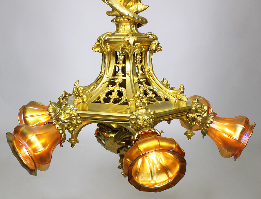 A Very Fine and Rare American Gothic-Revival Gilt-Bronze "Dragon" Six Light Figural Chandelier. The elongated body in the form of a winged dragon biting on a perch with his tail wrapped around an hexagonal pierced gilt-bronze basket surmounted with six lion masks, each holding an iridescence glass shade. The bottom of the fixture with the dragon's tail end, in the manner of Louis Comfort Tiffany (American, 1848-1933). Circa: New York, 1900.