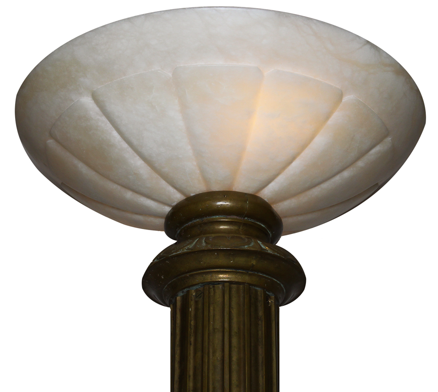 A Palatial Pair of French Belle Époque 19th-20th Century Gilt-Bronze and Alabaster* Tall Torcheres (Torchières). The slender center column raised on a circular intricately decorated base depicting vines, acanthus and with a beaded rim, all crowned with a two-light ovoid carved alabaster shade. Circa: 1900.