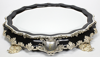 A Very Fine French 19th/20th Century Ebonized Wood and Figural Silver Plated Mounted Plateau Centerpiece in the manner of Buccellati. The ovoid shaped body surmounted with silvered bronze mount figures of dolphins, algae trim and centered with an engraved monogrammed shield, the top with a fitted beveled mirror. Circa: Paris, 1900.