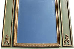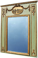 A French Louis XVI Style Belle Époque Trumeau Mirror Frame boasting a rich Verde Green hue accented with delicate parcel-gilt carvings. At its pinnacle rests an oval painting capturing a serene lake-view scene, ensconced within a meticulously carved parcel-gilt frame adorned with a gracefully crafted ribbon. Flanking either side are intricately detailed parcel-gilt carvings of floral swagged wreaths, acanthus motifs, and ribbons. Circa: 1900.