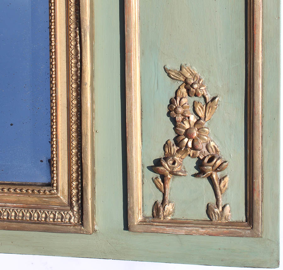 A French Louis XVI Style Belle Époque Trumeau Mirror Frame boasting a rich Verde Green hue accented with delicate parcel-gilt carvings. At its pinnacle rests an oval painting capturing a serene lake-view scene, ensconced within a meticulously carved parcel-gilt frame adorned with a gracefully crafted ribbon. Flanking either side are intricately detailed parcel-gilt carvings of floral swagged wreaths, acanthus motifs, and ribbons. Circa: 1900.