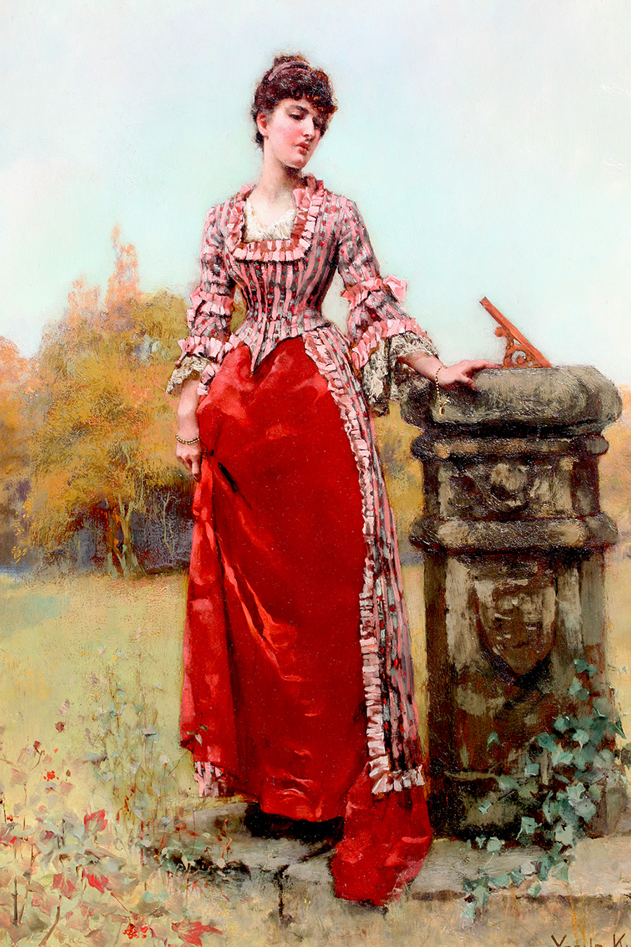 HENRY JOHN YEEND KING R.B.A, R.I., R.O.I. (British, 1855-1924) "At the Sundial" Oil on panel. Signed lower right: Yeend King. "YK" Sticker en verso. PROVENANCE: T. Richardson & Co. Fine Art Galleries, London (label verso). Within an ornate giltwood and gesso frame. Circa: 1890
