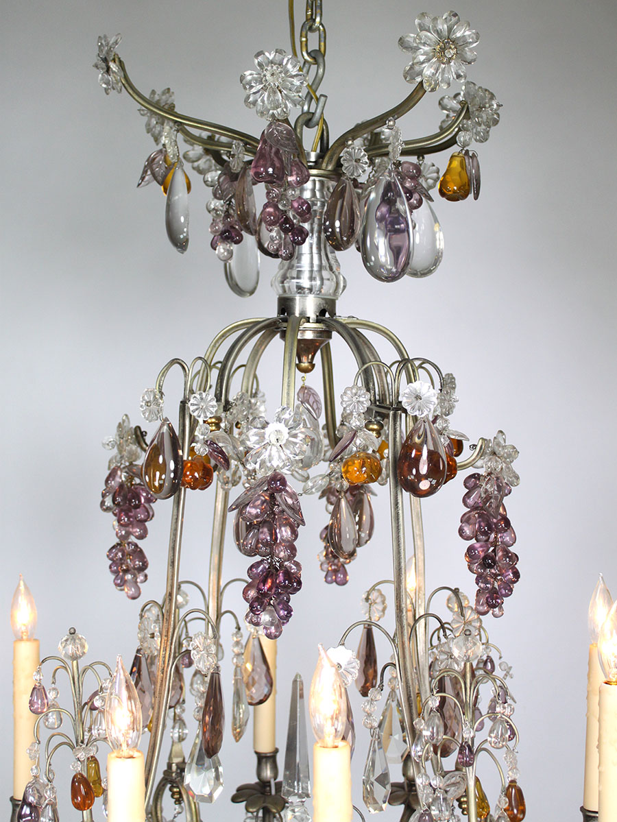 A Very Fine French Belle Époque 19th/20th Century Louis XV Style Eight-Light Silvered-bronze and Colored-Crystal Chandelier with amethyst grape clusters and molded glass pendants of fruit leaves, apples, pears and flowers. Circa: Paris, 1900.