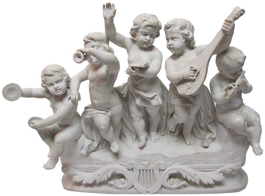 A Very Fine and Large Italian 19th Century Carrara Marble Group "Allegory to Music" Depicting five Bacchic Putti musicians playing various instruments. The finely carved Palatial Group with five children, the three center ones standing while the two at each end sitting on a rock, four of them playing cymbals, trumpet, mandolin and while one in the center reading music. This very sweet and charming group is one if the largest group of this subject ever offered by us. The high quality carving of the artist, gently capturing the emotions and artfulness of their repertory, make this one of the finest marble groups of it's kind currently available for sale. Signed: Luisi. Circa: Florence, 1880/1890.