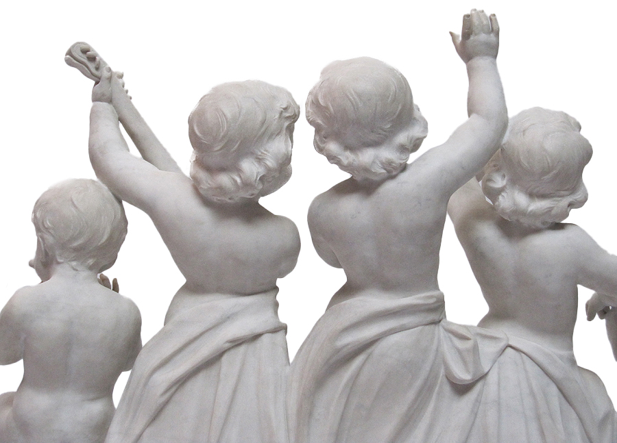 A Very Fine and Large Italian 19th Century Carrara Marble Group "Allegory to Music" Depicting five Bacchic Putti musicians playing various instruments. The finely carved Palatial Group with five children, the three center ones standing while the two at each end sitting on a rock, four of them playing cymbals, trumpet, mandolin and while one in the center reading music. This very sweet and charming group is one if the largest group of this subject ever offered by us. The high quality carving of the artist, gently capturing the emotions and artfulness of their repertory, make this one of the finest marble groups of it's kind currently available for sale. Signed: Luisi. Circa: Florence, 1880/1890.