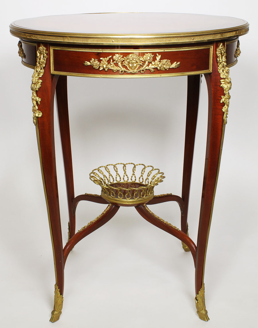 A Fine French 19th-20th Century Louis XV Style Gilt-Bronze Mounted Mahogany and Tulipwood Marquetry Guèridon Side-Table. The circular top inlaid with a floral design marquetry and symmetrical parquetry. The apron centered with ormolu mounts of female masks surmounted by floral cornucopias, the four legs with ormolu mounts of flowers and leaves, with hoofed feet and centered with an ormolu weaved basket. Attributed to François Linke (1855-1946). Unsigned. Circa: Paris, 1900.