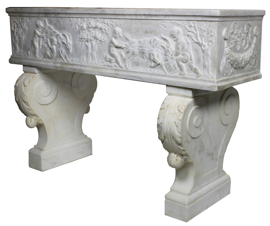 A Fine French 19th Century Whimsical Rococo Style White Marble Carved Planter Jardiniere with Figures of playful Putti playing with a goats among trees and vines, raised on twin pedestal stands with acanthus leaves. Circa: Paris, 1880-1890.