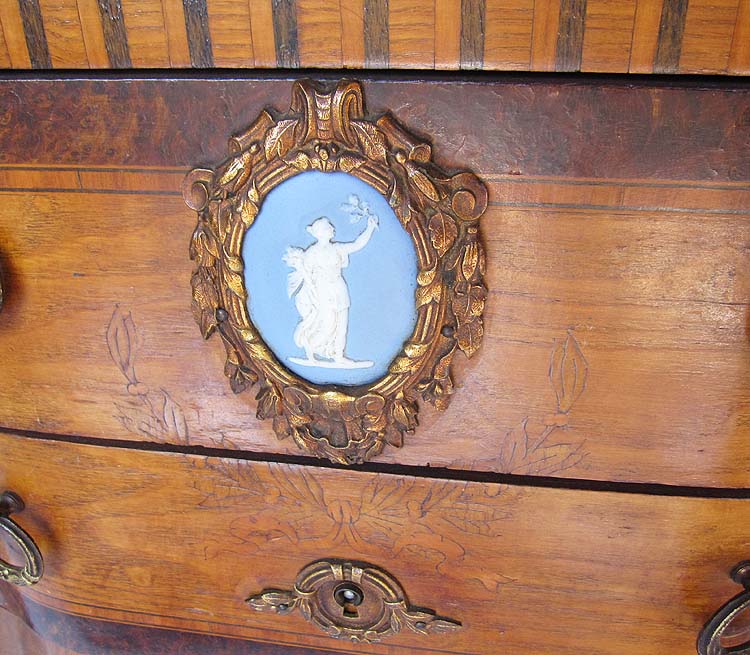 A French 19th/20th Century Louis XV Style Mahogany and Satinwood Marquetry and Parquetry Mini-Commode with gilt-bronze Mounts and centered with an Allegorical and Classical Wedgewood Plaque. Circa: Paris, 1900.