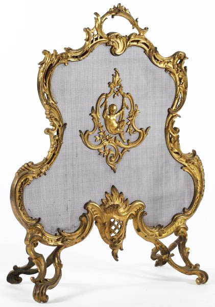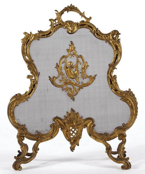A Fine French Belle Epoque Louis XV Style Gilt-Bronze Figural Fireplace Screen with scrolls and acanthus details and centered with a Putto on a swing. Circa: Paris, 1900.