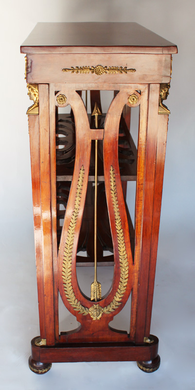A French 19th/20th Century Empire Style Mahogany and Gilt-Bronze Mounted Étagère with female masks, stars, wreaths, arrows and a center medallion with two putti and acanthus. The Circa: Paris, 1900.