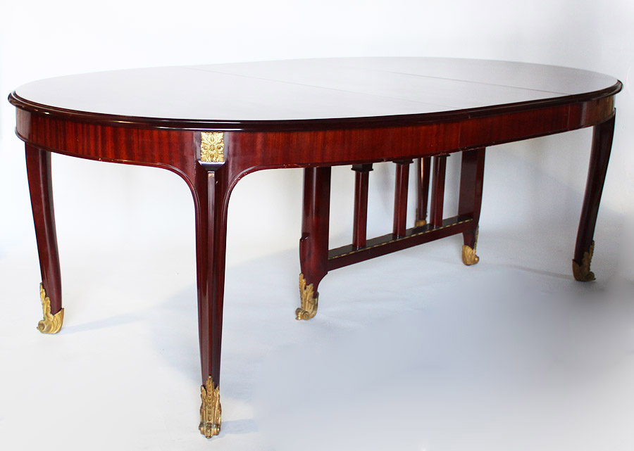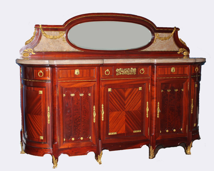 A Very Fine French 19th/20th Century Louis XV Style Mahogany & Gilt-Bronze Mounted Sixteen Piece Dining Set, comprising an oval table with three extensions and center support pedestal, twelve armchairs, a buffet, a server and a vitrine. Both server and buffet with marble top and framed marble and mirror backings. Circa: Paris, 1900.