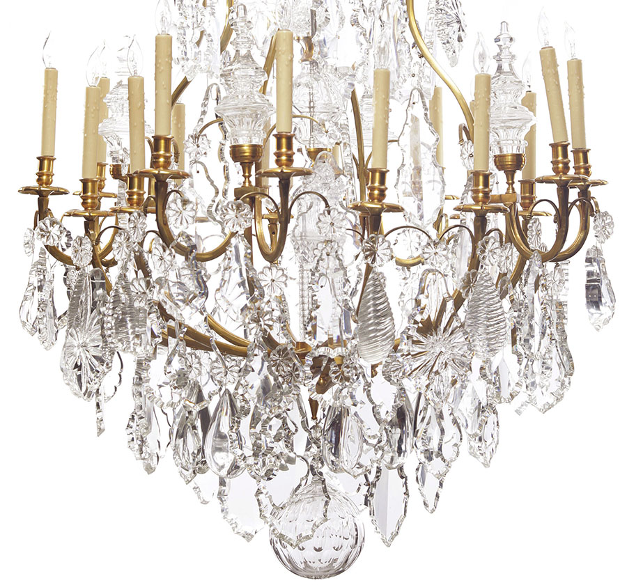 A Louis XV Style Gilt-Bronze and Lead Crystal Sixteen-Light Chandelier, the solid bronze frames with towers, fleur de lys' and a central support, attributed to Baccarat. Circa: 20th Century.