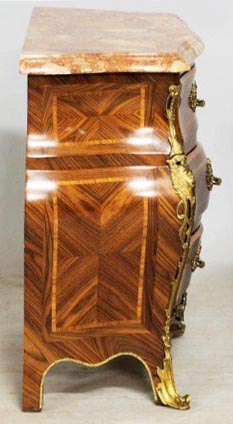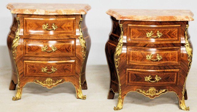A Pair of French Louis XV Style Gilt-Bronze Mounted Kingwood Three-Drawer Mini-Commodes with Marble Top.