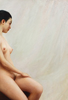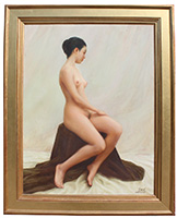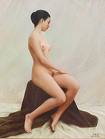 ZHAI XINJIAN (China, b. 1950) An Oil on Canvas Titled "The Nude Model Girl" depicting a female nude model posing seated on a draped stool, within a gilt-wood frame. Signed in Chinese and Dated : 1987-9-20 (lower-right).