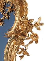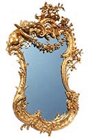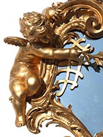 A Very Fine and Large French 19th/20th Century Louis XV Style Belle Époque Gildwood Carved Figural Mirror Frame, Surmounted with a Hovering Cherub, a Cherub Mask, Scrolls, Leaves, Acanthus and Floral Wreaths. All gilding original. Circa: Paris, 1900.