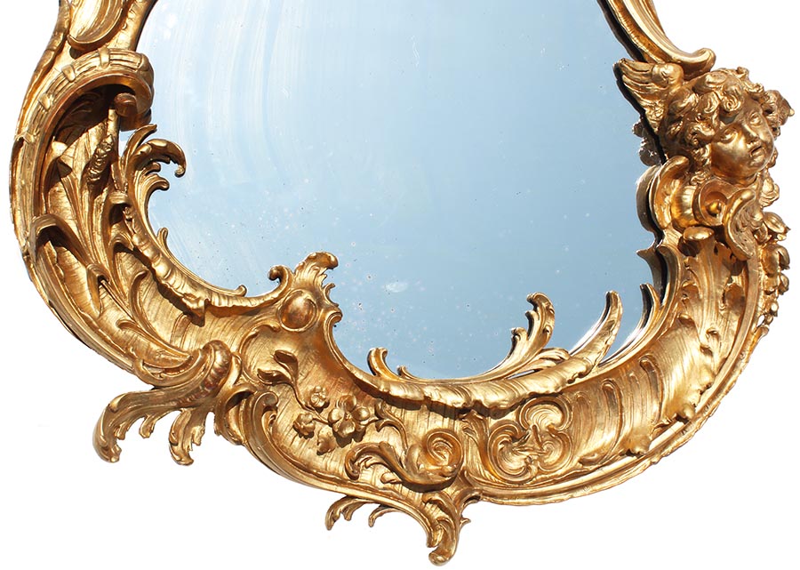 A Very Fine and Large French 19th/20th Century Louis XV Style Belle Époque Gildwood Carved Figural Mirror Frame, Surmounted with a Hovering Cherub, a Cherub Mask, Scrolls, Leaves, Acanthus and Floral Wreaths. All gilding original. Circa: Paris, 1900.