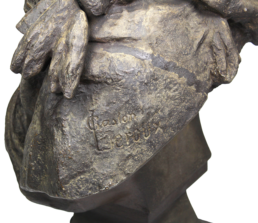 A Large and Impressive French 19th Century Life-Size Bust of Othello, the North African Moor of Venice character in the 1603 play written by William Shakespeare (1564-1616), after the model by Gaston Veuvenot Leroux (French, 1854-1942). The imposing figure of a black bearded male Moor, posing with a profile gaze, wearing a Fez hat and a loosely draped attire, raised on a square plinth with a plaque that reads 'Othello'. Signed and dated on left shoulder: 'Gaston Leroux, 1887'. Circa 1887.