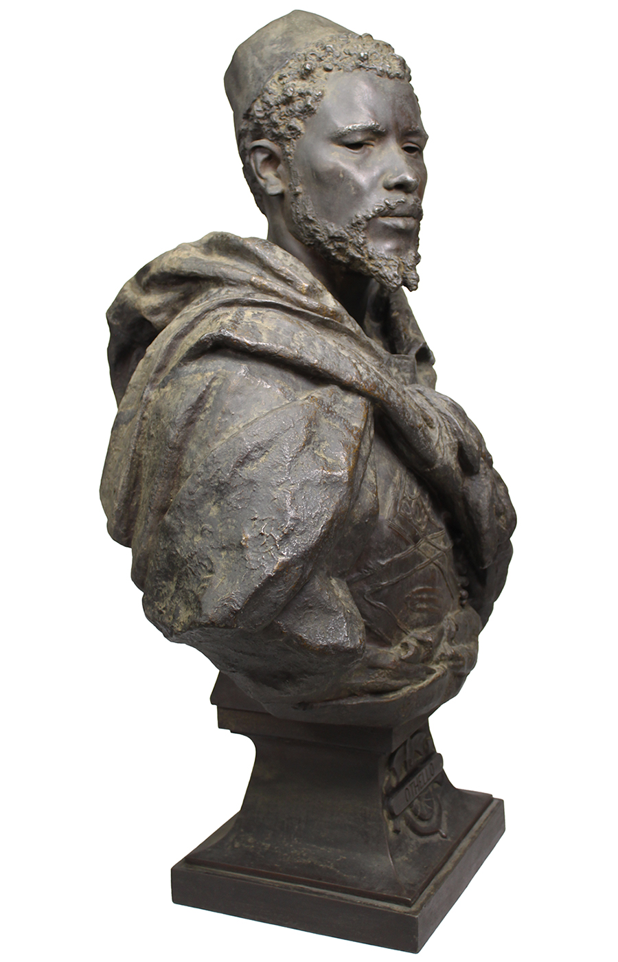 A Large and Impressive French 19th Century Life-Size Bust of Othello, the North African Moor of Venice character in the 1603 play written by William Shakespeare (1564-1616), after the model by Gaston Veuvenot Leroux (French, 1854-1942). The imposing figure of a black bearded male Moor, posing with a profile gaze, wearing a Fez hat and a loosely draped attire, raised on a square plinth with a plaque that reads 'Othello'. Signed and dated on left shoulder: 'Gaston Leroux, 1887'. Circa 1887.