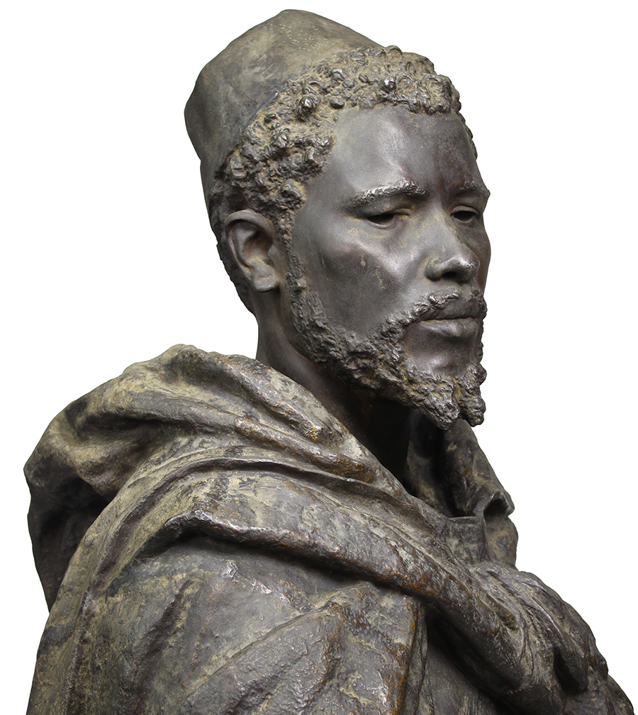 A Large and Impressive French 19th Century Life-Size Bust of Othello, the North African Moor of Venice character in the 1603 play written by William Shakespeare (1564-1616), after the model by Gaston Veuvenot Leroux (French, 1854-1942). The imposing figure of a black bearded male Moor, posing with a profile gaze, wearing a Fez hat and a loosely draped attire, raised on a square plinth with a plaque that reads 'Othello'. Signed and dated on left shoulder: 'Gaston Leroux, 1887'. Circa 1887.