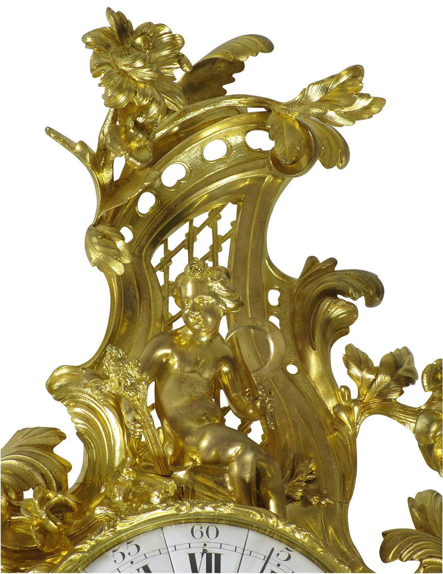 A Very Fine and Palatial French 19th Century Louis XV Style Gilt-Bronze Figural Cartel Clock by Lerolle Frères, the finely frame body with a circular face with Roman numerals, the center with a profile of King Louis XV and inscribed Lerolle Frères, behind a glass door, surmounted with floral scrolls, flowers, acanthus and an intricate lacing, crowned with a scrolled top and a seated putto holding a bundle of wheat and a sickle, emblematic of the harvesting. Circa: Paris, 1870-1880.