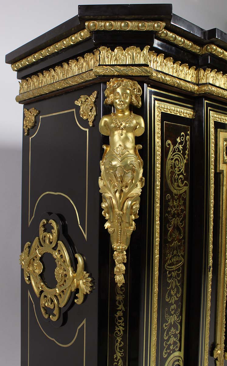 A Fine French Napoleon III Ebonized, Gilt-Bronze Mounted and Tortoiseshell Meuble à Hauteur d'Appui in the Manner of André Charles Boulle (French, 1642-1732) with a Fitted Black Marble Top, by Mathieu Befort, dit Befort Jeune. The ormolu stamped "BEFORT". Circa: Paris, 1870-80.