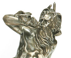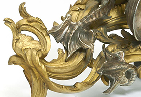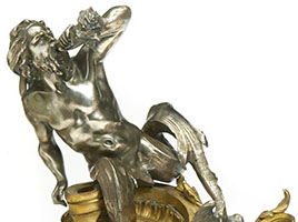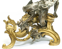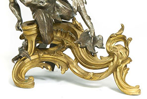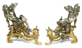 A Fine Pair of French 19th Century Louis XV Style Figural Gilt-Bronze and Silver-Plated Bronze Chenets, each surmounted by a Triton blowing a seashell horn, resting on a pierced rocaille gilt-bronze base. Stamped "GJL 956" and "EM 361" on the reverse. Circa: Paris, 1890.