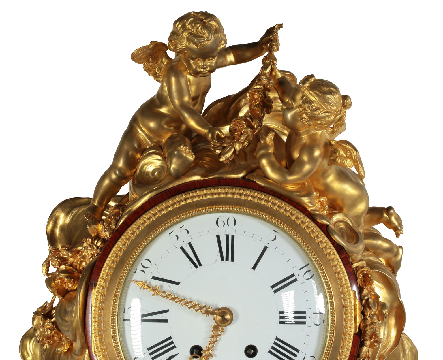 This clock is a copy of the celebrated model made circa 1785 and attributed to Jean-Henri Riesener, now in the Louvre (cat. C.Dr., No 185) illustrated in Pierre Verlet, Les Bronzes Dorés Français du XVIIIe Siècle, Picard, 1999, pp. 116 and 384.