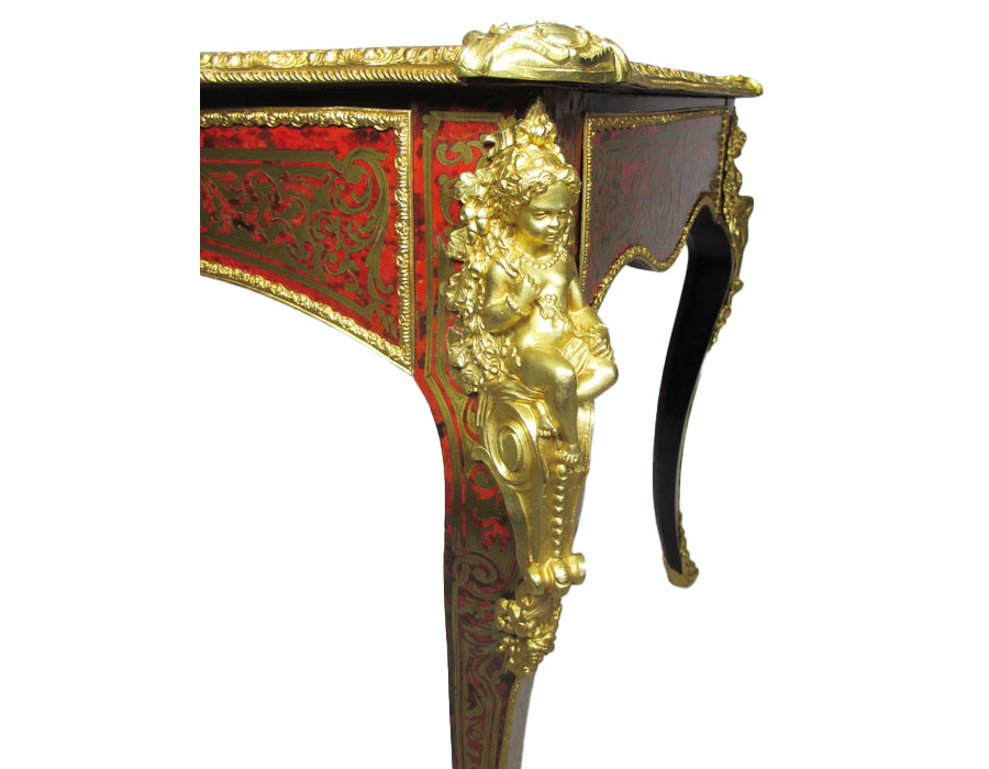 A Fine French Napoleon III Gilt-Bronze Mounted, Ebonized and Cut-Brass Inlaid Tortoiseshell Writing Table - Center Table - Desk with a single drawer, in the Manner of André Charles Boulle (French, 1642-1732). The rectangular top with an ornate Boulle style design, centered with a standing maiden amongst flowers and wreaths, above a lambrequin centered frieze flanked to the front by a sprung drawer, on cabriole legs headed by allegorical figures of seated putti with flowers running to scroll feet Circa: 1860-1870.