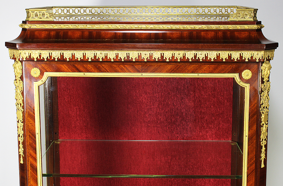 A Very Fine French Belle Époque 19th Century Tulipwood and Gilt-bronze Mounted Vernis Martin Decorated Vitrine by Louis Majorelle (French, 1859-1926). The single door case with a hand painted board depicting a garden courting scene surmounted with ormolu wreaths and a banded frame. The top with a pierced gilt-bronze gallery above an ormolu royal tassel trim flanked by a pair of female masks above crossed torches and flames, cross flutes, a tambourine, a pan flute, ribbons and a tassel. Raised of four cabriolet legs with corner ormolu wreaths and leaves ending with hooves. Circa: Paris, 1990.