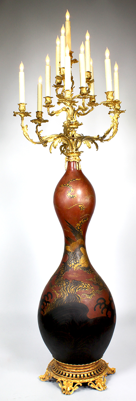A Fine Pair of 19th Century Japanese Imari Porcelain and French Gilt-Bronze Mounted Thirteen-Light Celadon Torchere Candelabra. The bottle-shaped vase with a Royal red background, decorated with parcel-gilt and black soaring eagles in the hunt within a forestall scene. Each Vase fitted and surmounted with a French 19th century Louis XV Style 13-Light scrolled candelabrum and all raised on a circular pierced gilt-bronze plinth. Circa: 1880.