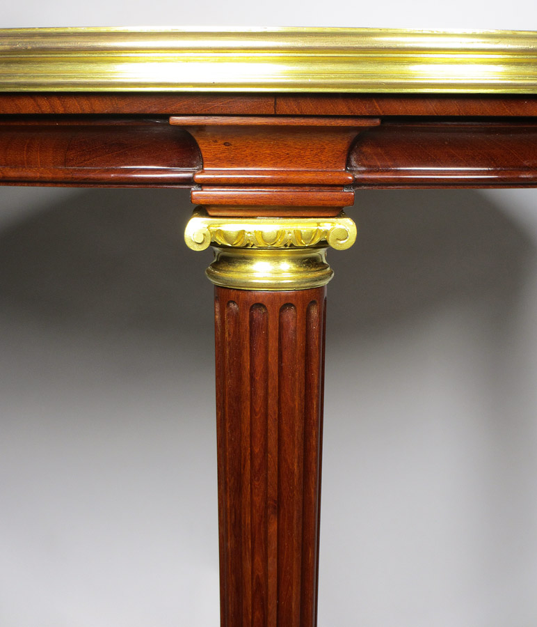 A Very Fine French 19th-20th Century Louis XVI Style Mahogany and Gilt-Bronze Mounted Circular Side Table (Gueridon) by Maison Jansen, Paris. The tapered fluted legs fitted with classical ormolu capitols descending into a sunburst shaped stretcher and finishing with tapered turned feet with gilt bronze casters. Stamped twice "JANSEN" underneath, Paris, circa 1900.