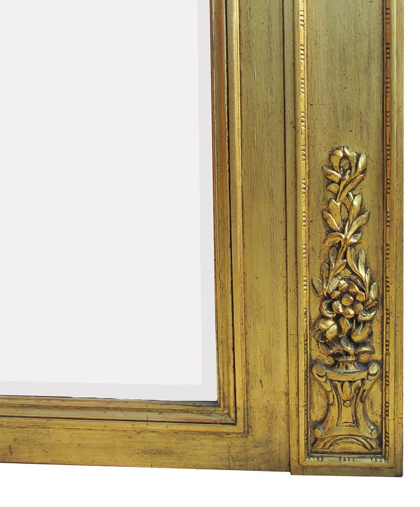 A Large French 19th-20th Century Louis XV Style Giltwood Carved Trumeau Mirror Frame, surmounted with a pair gilt bronze three-light wall lights with scrolled arms (electrified), the top of the mirror centred with an allegorical carving of musical instruments, acanthus, bows and ribbons and with carvings of bow-tied trumpets with an arrow and tassels on each side; each bottom corner with a carving depicting a vase and stand with a floral arrangement. The mirror plate is bevelled. The fabric bulb-shades are recent. Circa: Paris, 1900.