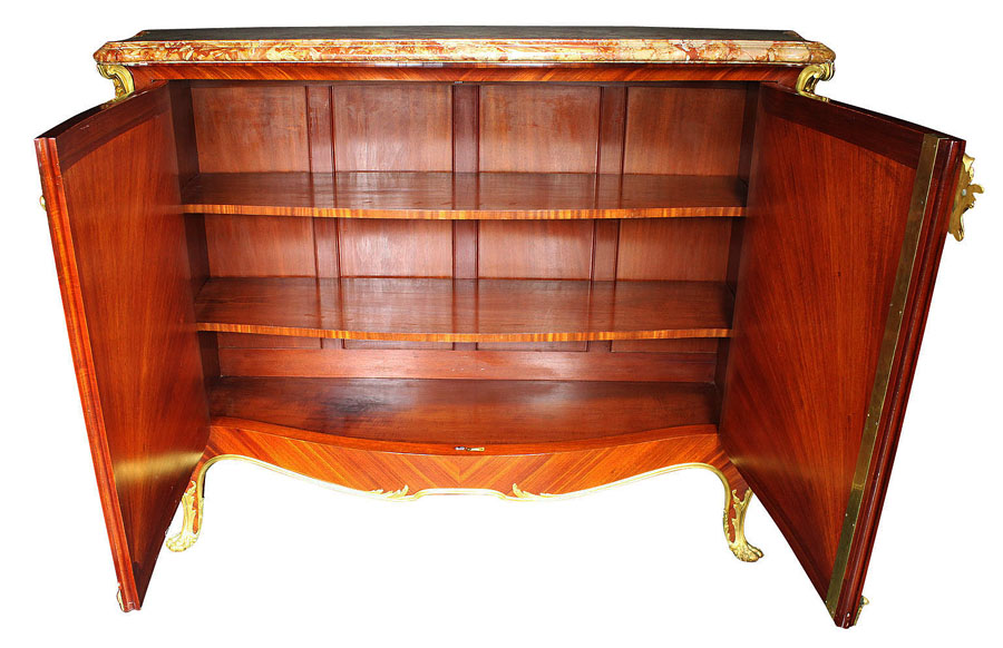 A Superb Quality French 19th Century Louis XV Style Ormolu Mounted Marquetry Two-Door Meuble D'Appui Attributed to Joseph-Emmanuel Zwiener. The serpentine molded marble top over a conforming case fitted with two doors centered by a floral spray within gilt-bronze encardrements, raised on cabriole legs ending in cast-paw-feet. Circa: Paris, 1900.