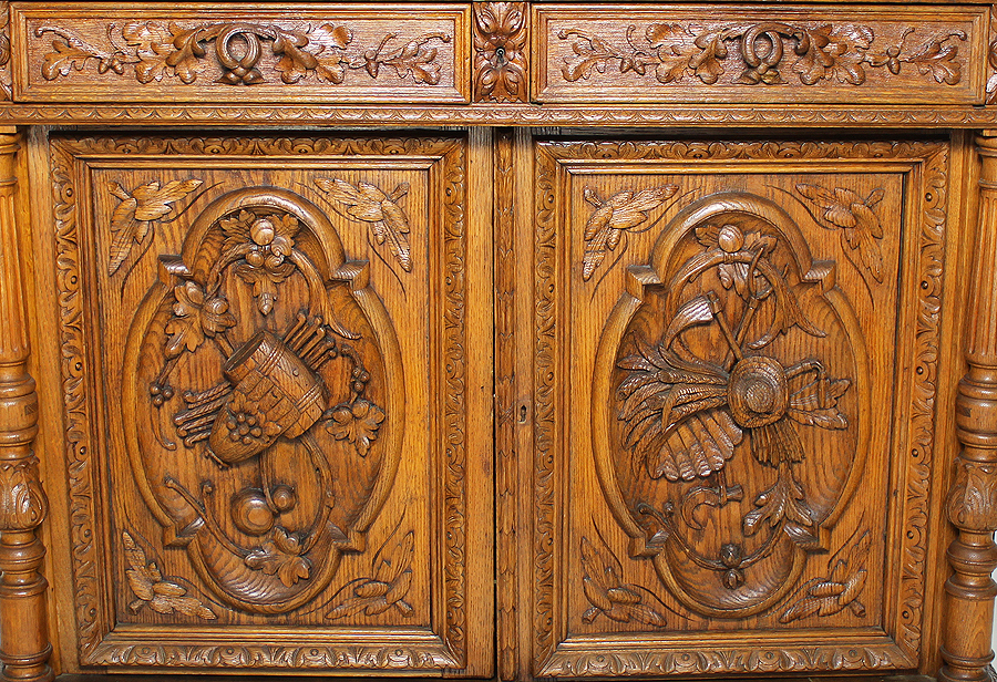 A Fine and Rare Italian 19th Century Baroque Style Oak-Carved Figural Server Cabinet. The upper part crowned with an architectural carving above a paneled shelf, surmounted on each side with a figure of winged dragons, all above a two-drawers and two-doors enclosure with carvings of barrels, vines, flowers, wheat representing the harvest, fitted with a veined Riviera brown marble top. Circa: Florence, 1880.