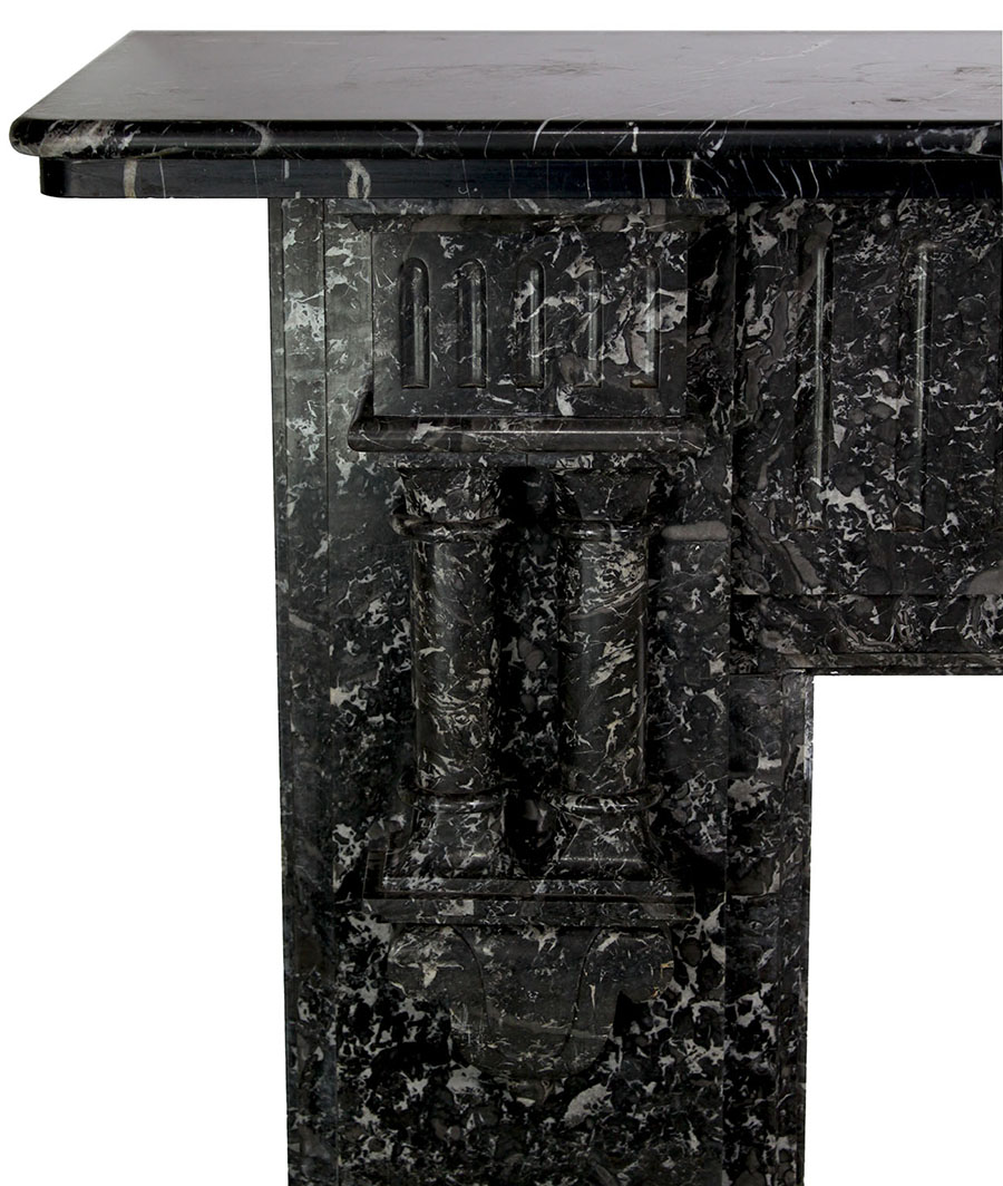 A Fine French 19th-20th Century Louis XVI Style Veined Grey and White Marble Fireplace Mantel Surround, surmounted with a pair of cylindrical marble columns and an edged frieze. Circa: Paris, 1900.