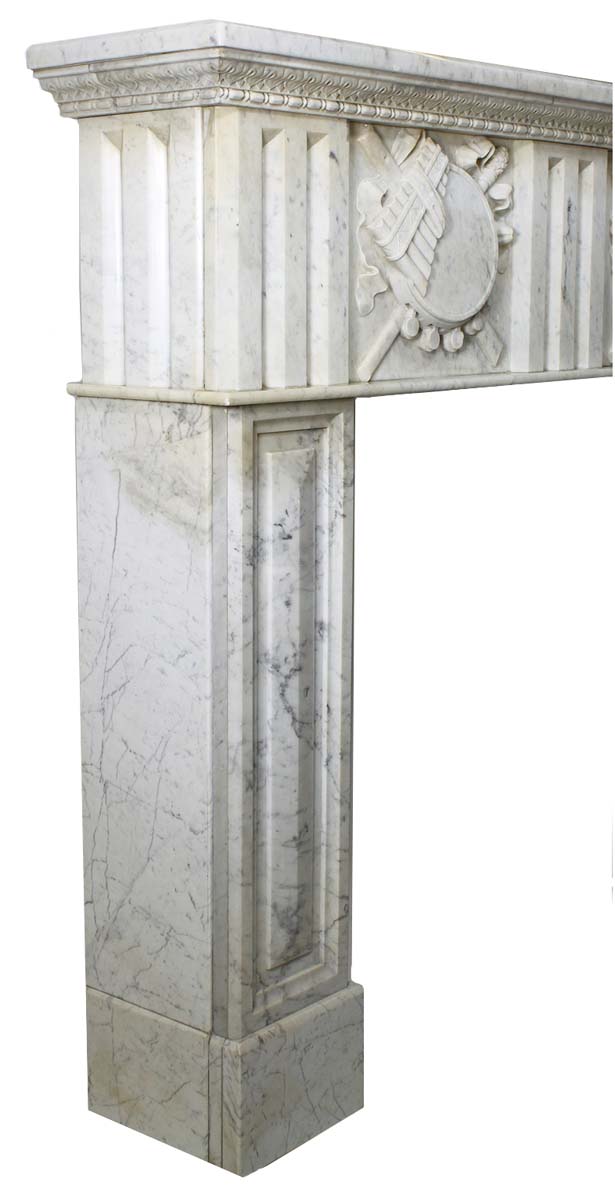 Fine French 19th Century Louis XVI Style Carved White Marble Fireplace Mantel Surround. The apron with carvings of musical instruments and allegorical to abundance with fruits and ribbons within an urn. Circa: Paris, 1880.
