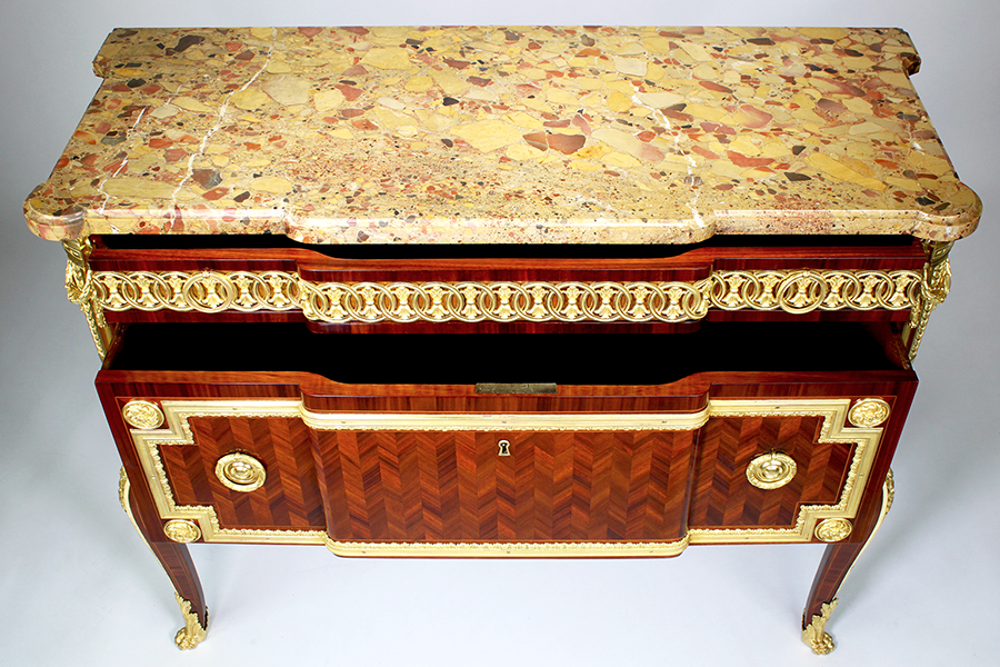 A Very Fine Pair of French 19th/20th Century Louis XV/XVI Style Transitional Style Satinwood Parquetry and Gilt-Bronze Mounted Commodes with Brêche d'Alep marble-tops, attributed to François Linke (1855-1946), inspired by models by Léonard Boudin (French, 1735-1804), Gilles Joubert (French, 1689–1775) and Jean-Henri Riesener (German, 1734-1806). The rectangular shaped bodies and mild serpentine fronts, each with a large drawer surmounted with ormolu wreath-ring pulls, the banded ormolu aprons with interlocking rings centered with acorn finials and keyhole escutcheons, the corners surmounted with ormolu acanthus shield mounts centered with swagged wreaths, raised on four cabriolet legs ending with with lion-paw-cast sabots. (Unsigned-Unmarked). Circa: 1890-1900.