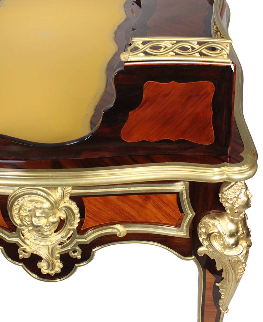 A Very Fine French Louis XV Style Mahogany and Satinwood Gilt-Bronze Mounted Figural Cartonnier Bureau-Plat (Desk). The shaped rectangular top inset with a recent tooled leather writing panel surmounted by a Serre-Papiers Cartonnier, each corner mounted with female ormolu caryatids, fitted with three drawers to the undulating frieze, raised on cabriole legs. Circa: Paris, 1880-1890.