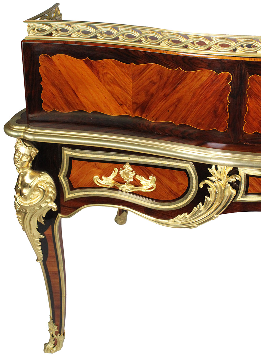 A Very Fine French Louis XV Style Mahogany and Satinwood Gilt-Bronze Mounted Figural Cartonnier Bureau-Plat (Desk). The shaped rectangular top inset with a recent tooled leather writing panel surmounted by a Serre-Papiers Cartonnier, each corner mounted with female ormolu caryatids, fitted with three drawers to the undulating frieze, raised on cabriole legs. Circa: Paris, 1880-1890.