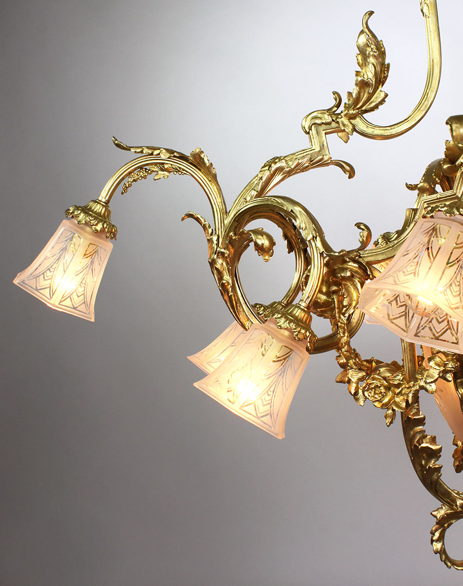 A Fine and Large French Belle Époque Gilt-Bronze and Molded Glass Fifteen-Light "Lyre Style" Chandelier. The ovoid shaped gilt-bronze downcast foliate body surmounted with ten scrolled arm-lights fitted with acid-edged molded etched glass shades, the central stem cast bowl fitted with molded glass panels depicting trophies and flanked with gilt-bronze floral wreaths and four interior lights, all topped with a single glass shade-light below the gilt-bronze ceiling floral canopy. Circa: Paris, 1900.