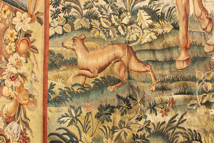 A Fine and Large Flemish 17th-18th Century Baroque Figural Historical Tapestry. The large tapestry depicting an allegorical Royal family scene of a warrior meeting his new born child surrounded by his family and Royal members of the Court, the newborn baby on the ground. A floral border wreath trim decorates all sides. Brussels, circa 1700s.