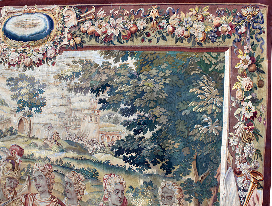A Fine and Large Flemish 17th-18th Century Baroque Figural Historical Tapestry. The large tapestry depicting an allegorical Royal family scene of a warrior meeting his new born child surrounded by his family and Royal members of the Court, the newborn baby on the ground. A floral border wreath trim decorates all sides. Brussels, circa 1700s.