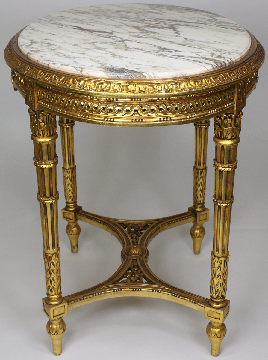 A French Louis XVI Style 'Belle Epoque' Oval Giltwood Carved Center Table with Marble Top. The ornately decorated apron topped with a veined white marble top and raised on four fluted legs conjoined with a "X" carved stretcher. Circa: 1900's.